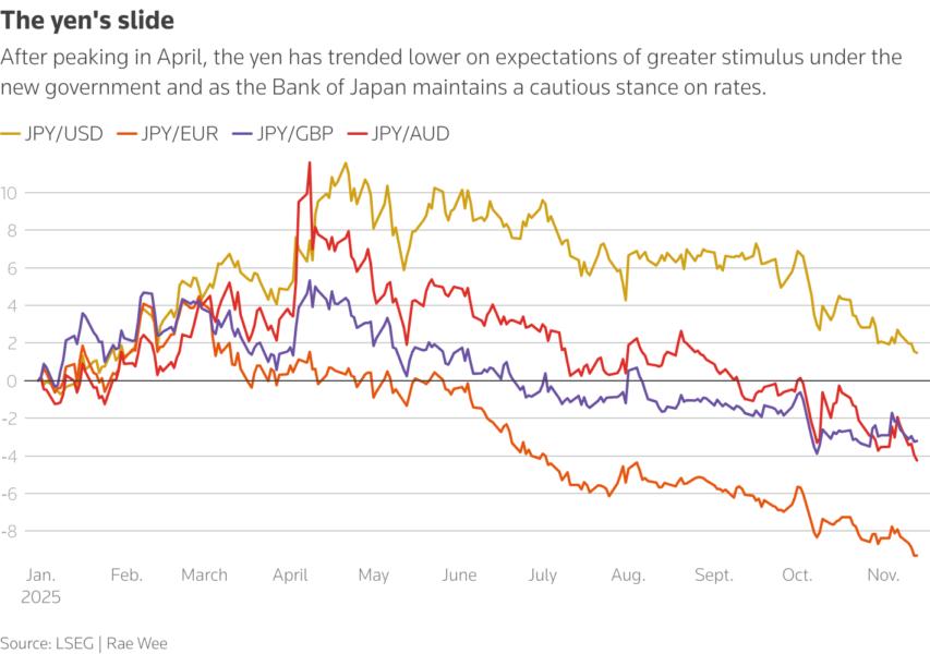 Κόκκινος συναγερμός ξέσπασε την Τρίτη 11 Νοεμβρίου 2025 στο υπουργείο Οικονομικών της Ιαπωνίας καθώς, το γεν υποχώρησε προς το 155 έναντι του δολαρίου, οδηγώντας σε παρέμβαση στην αγορά συναλλάγματος.