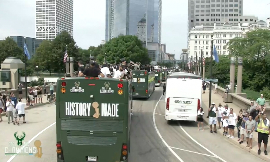 Ο Greek Freak βρίσκεται στο κεντρικό λεωφορείο των "ελαφιών" μαζί με την έγκυο σύντροφό του Μαράια και τον γιό τους Λίαμ-Τσαρλς τη μητέρα του Βερόνικα και την παρέα των υπόλοιπων παικτών των Bucks ενώ στους δρόμους της πόλης επεφημούν χιλιάδες κόσμου.