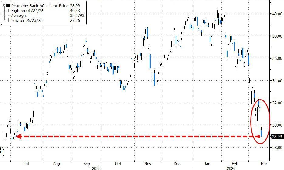 Οι μετοχές της Deutsche Bank υποχωρούσαν 8% μέσα στην ημέρα (η μεγαλύτερη πτώση από την «Ημέρα Απελευθέρωσης» τον περασμένο Απρίλιο), φτάνοντας στο χαμηλότερο επίπεδο από τον Ιούλιο του 2025.