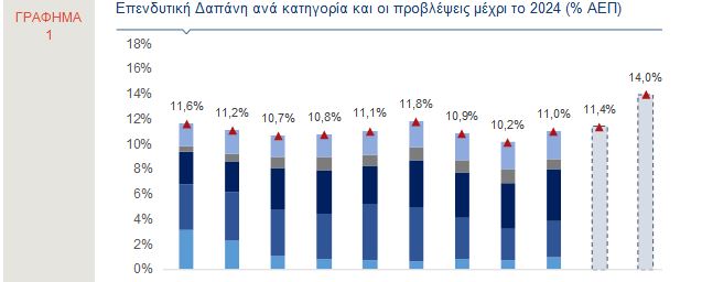 Πιο αναλυτικά, κατά τα πρώτα έτη της προηγούμενης οικονομικής κρίσης, ο λόγος των επενδύσεων προς το ΑΕΠ ακολούθησε καθοδική τροχιά, φθάνοντας, το 2014, στο 10,7%, από 21,5%, το 2009. Κατά την τριετία 2015-2017, οι επενδύσεις στην Ελλάδα ανήλθαν, σταδιακά, στο 11,8% του ΑΕΠ, ενώ, τη διετία 2018-2019, παρά την άνοδο της οικονομικής δραστηριότητας, κατέγραψαν εκ νέου πτώση.