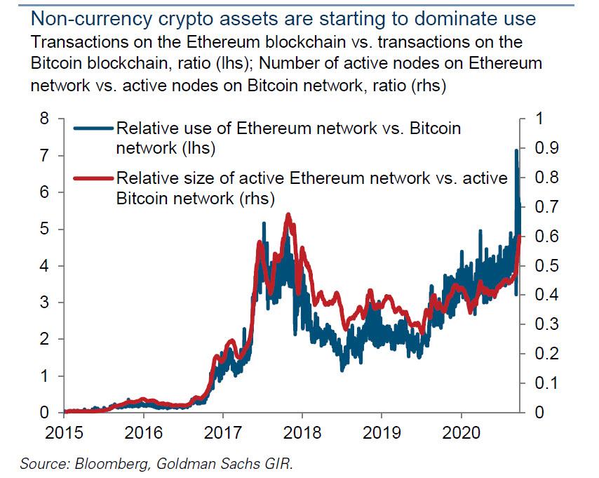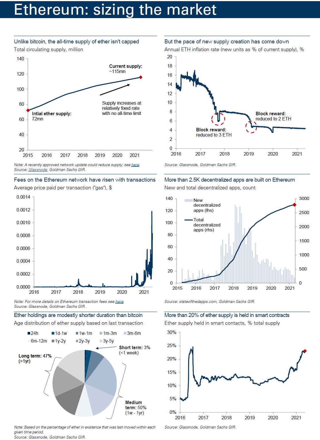 Στην έκθεση της η Goldman Sachs φαίνεται ότι δείχνει την προτίμηση της στο Εthereum (μια εντελώς νέα τεχνολογική πλατφόρμα) έναντι του Bitcoin (ένα asset αξίας και ένα εναλλακτικό σύστημα πληρωμών) καθώς οι τρεις μεγαλύτερες κινήσεις στο οικοσύστημα των κρυπτονομισμάτων - πληρωμές, DeFi και NFTs - βασίζονται κυρίως στο Ethereum.