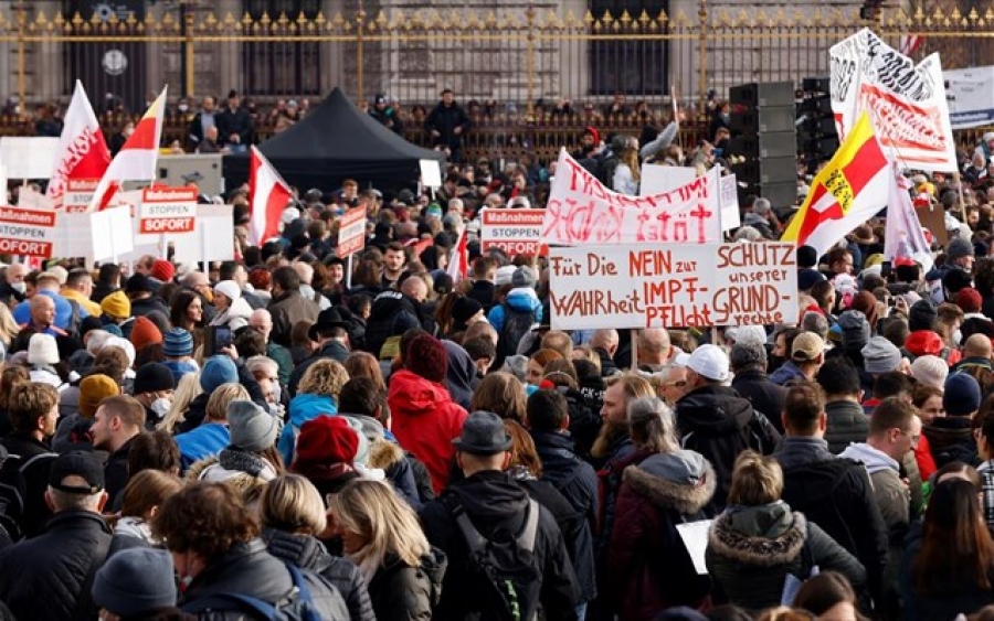 Το πλήθος που συγκεντρώθηκε στην καρδιά της πρωτεύουσας, σε μικρή απόσταση από την καγκελαρία, κρατούσε πανώ με συνθήματα κατά της «δικτατορίας του κορωνοϊού».