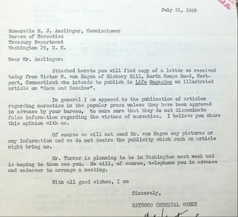 Ο Anslinger απάντησε στην επιστολή του Hartung με ένα σημείωμα προς τον Ralph Hayes, τον Αντιπρόεδρο της Coca-Cola Company εκείνη την εποχή, λέγοντας: «Συμφωνώ μαζί σας ότι αυτά τα άρθρα δεν εξυπηρετούν κανένα σκοπό παρά μόνο να κάνουν κακό».