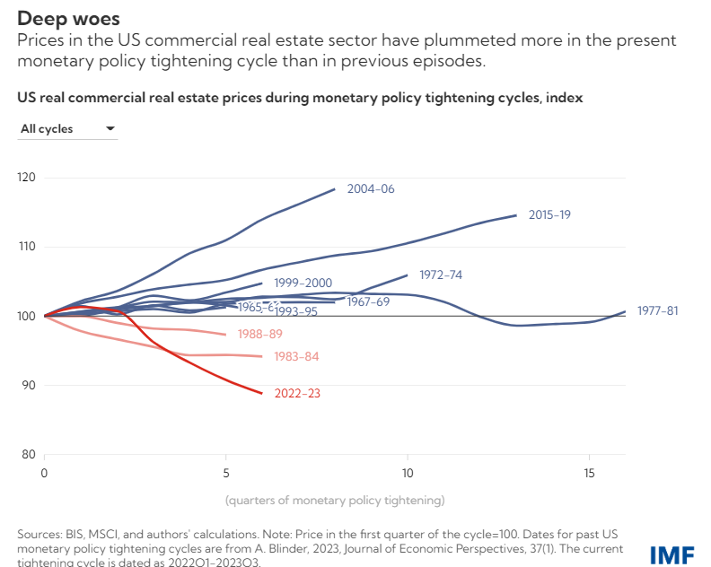 «Ο τομέας των εμπορικών ακινήτων βρίσκεται υπό έντονη πίεση παγκοσμίως, καθώς τα επιτόκια έχουν αυξηθεί τα τελευταία δύο χρόνια. Στις Ηνωμένες Πολιτείες, με τη μεγαλύτερη αγορά εμπορικών ακινήτων στον κόσμο, οι τιμές έχουν υποχωρήσει κατά 11% από τότε που η Federal Reserve άρχισε να αυξάνει τα επιτόκια τον Μάρτιο του 2022, διαγράφοντας τα κέρδη των δύο προηγούμενων ετών.