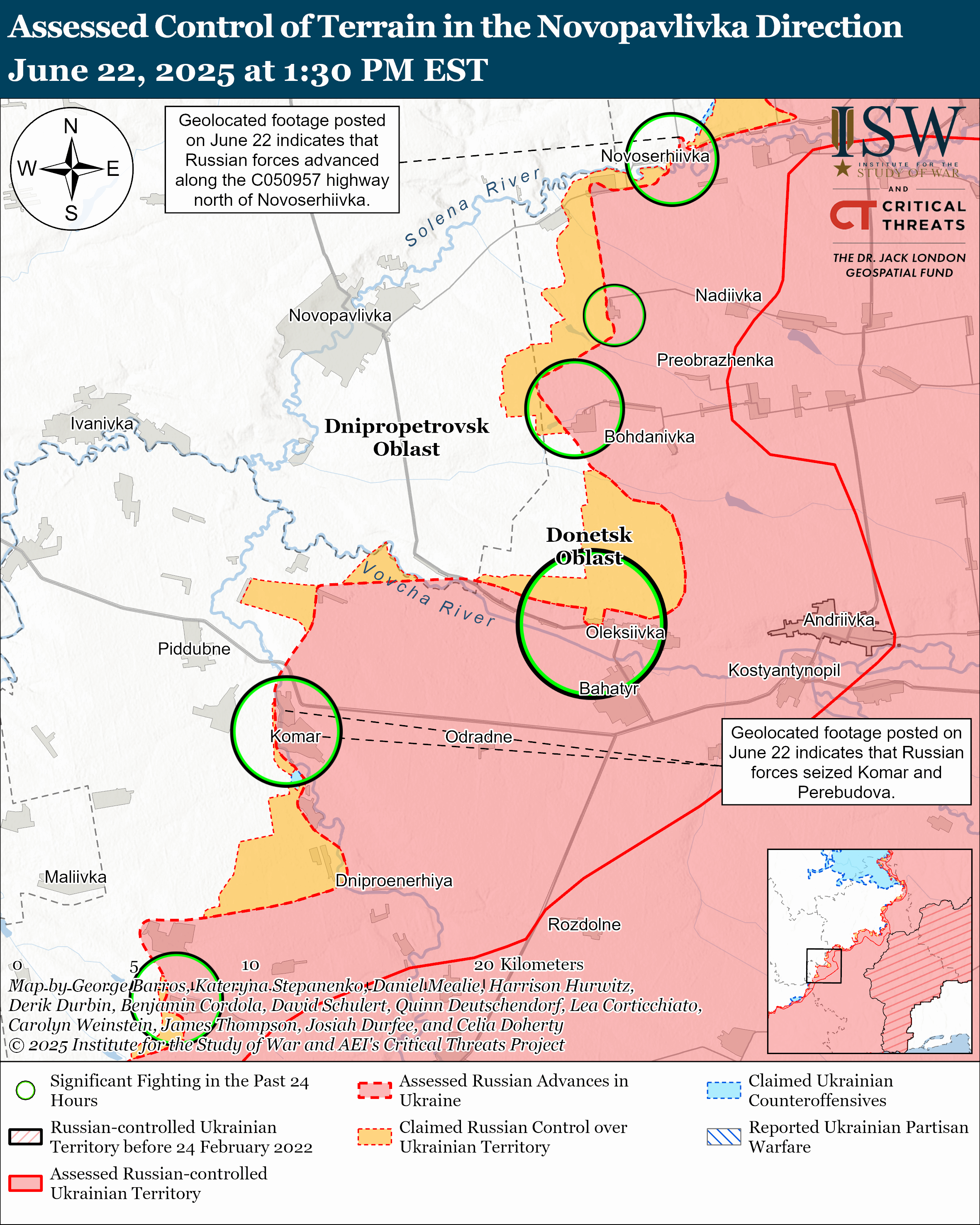 Πρόσθετα γεωγραφικά πλάνα που δημοσιεύθηκαν στις 22 Ιουνίου δείχνουν ότι οι ρωσικές δυνάμεις προέλασαν πρόσφατα βορειοανατολικά της Novopavlivka).