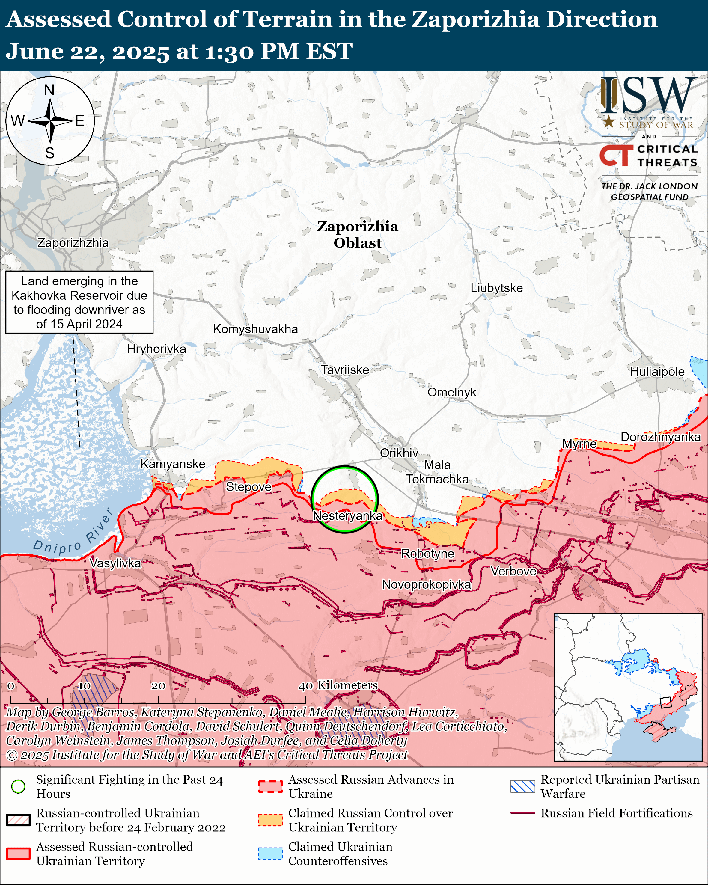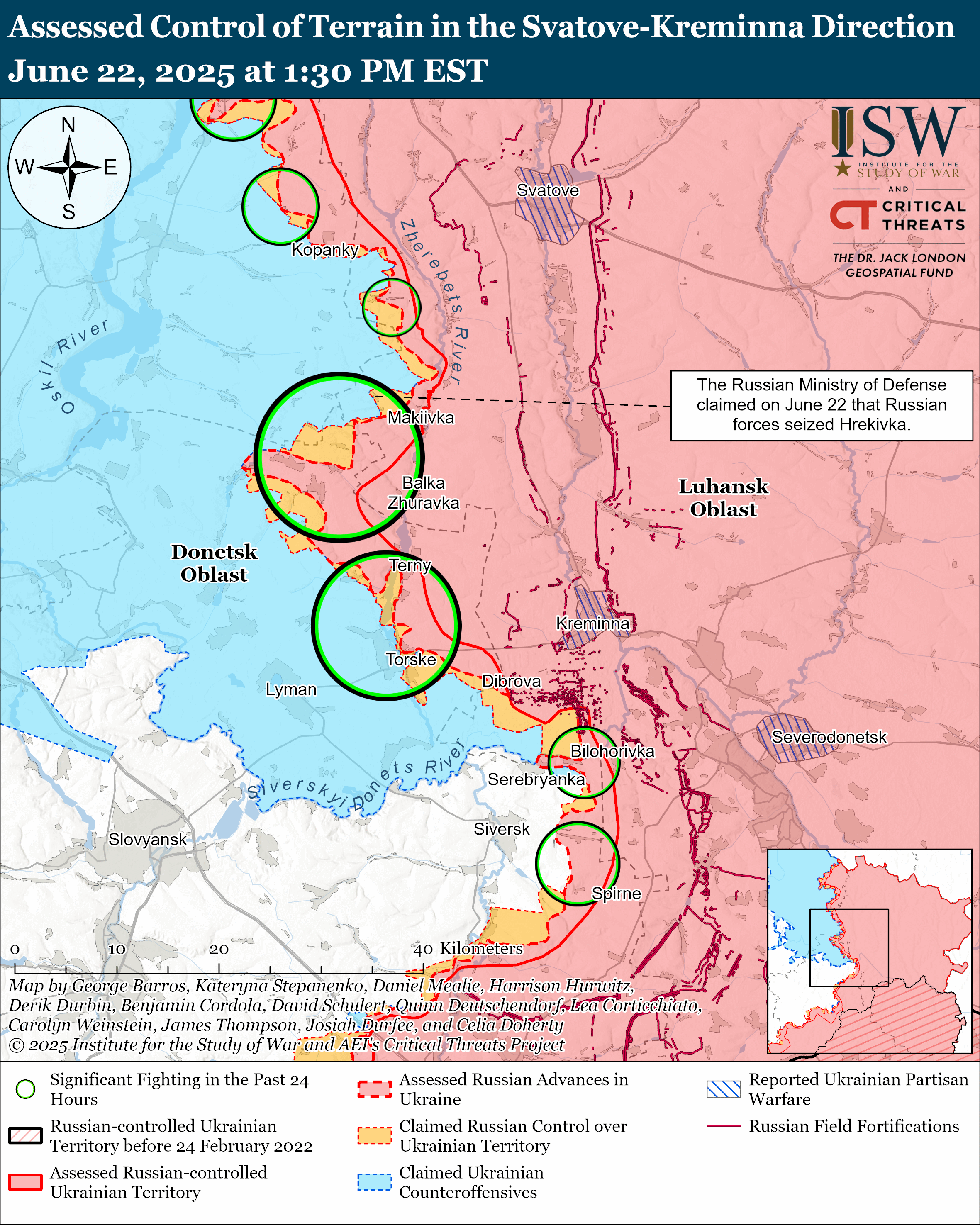 Οι ρωσικές δυνάμεις συνέχισαν να επιδιώκουν μακροχρόνιους επιχειρησιακούς στόχους στο πεδίο της μάχης στην Ουκρανία καθ' όλη τη διάρκεια της άνοιξης και του καλοκαιριού του 2025 και πιθανότατα θα παραμείνουν προσηλωμένοι σε αυτούς τους στόχους και τους επόμενους μήνες.