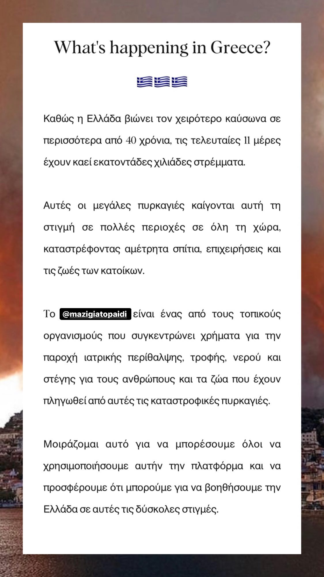 Μοιράζομαι αυτό για να μπορέσουμε όλοι να χρησιμοποιήσουμε αυτή την πλατφόρμα και να προσφέρουμε ό,τι μπορούμε για να βοηθήσουμε την Ελλάδα σε αυτές τις δύσκολες στιγμές».